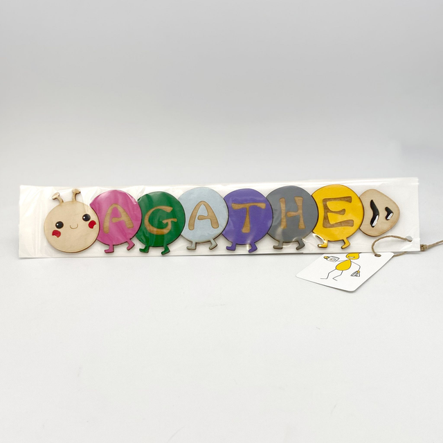 Conception originale de pièces en bois peintes qui ont été découpées et gravées au laser pour former un prénom en forme de chenille.