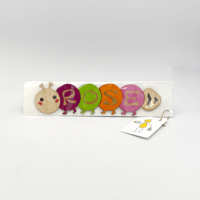 Conception originale de pièces en bois peintes qui ont été découpées et gravées au laser pour former un prénom en forme de chenille.