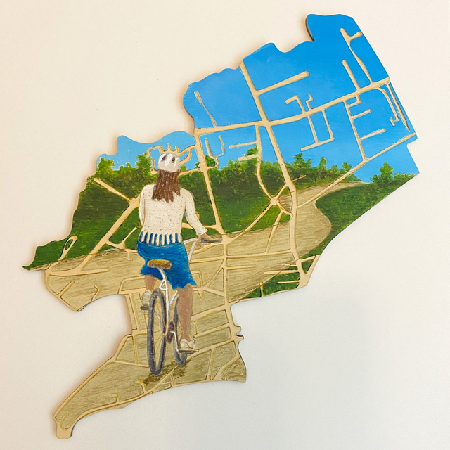 Création originale inspiré par la voie verte en illustrant un cycliste, peintes à la main sur une pièce de bois découpée et gravée au laser.